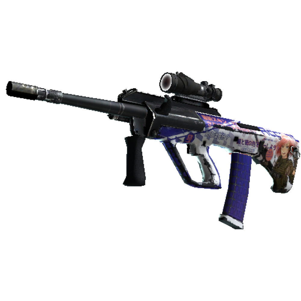 A powerful and accurate rifle with an AUG telescopic sight, it compensates for its long reload time with low bullet spread and a high rate of fire. Covered with vinyl in the style of an anime magazine cover.