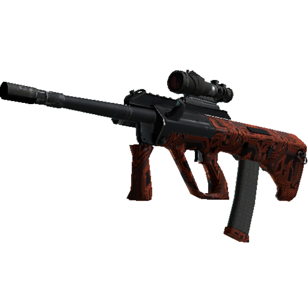 A PowerFul and Accurate Rifle with The Optical Sight Aug Compensates for Its Long Reloading with A Low Spread of Bullets and High Rate of Fire. The Case Is Covered with A Black Base on Which a Red Pattern Resembles a System Board is Applied.