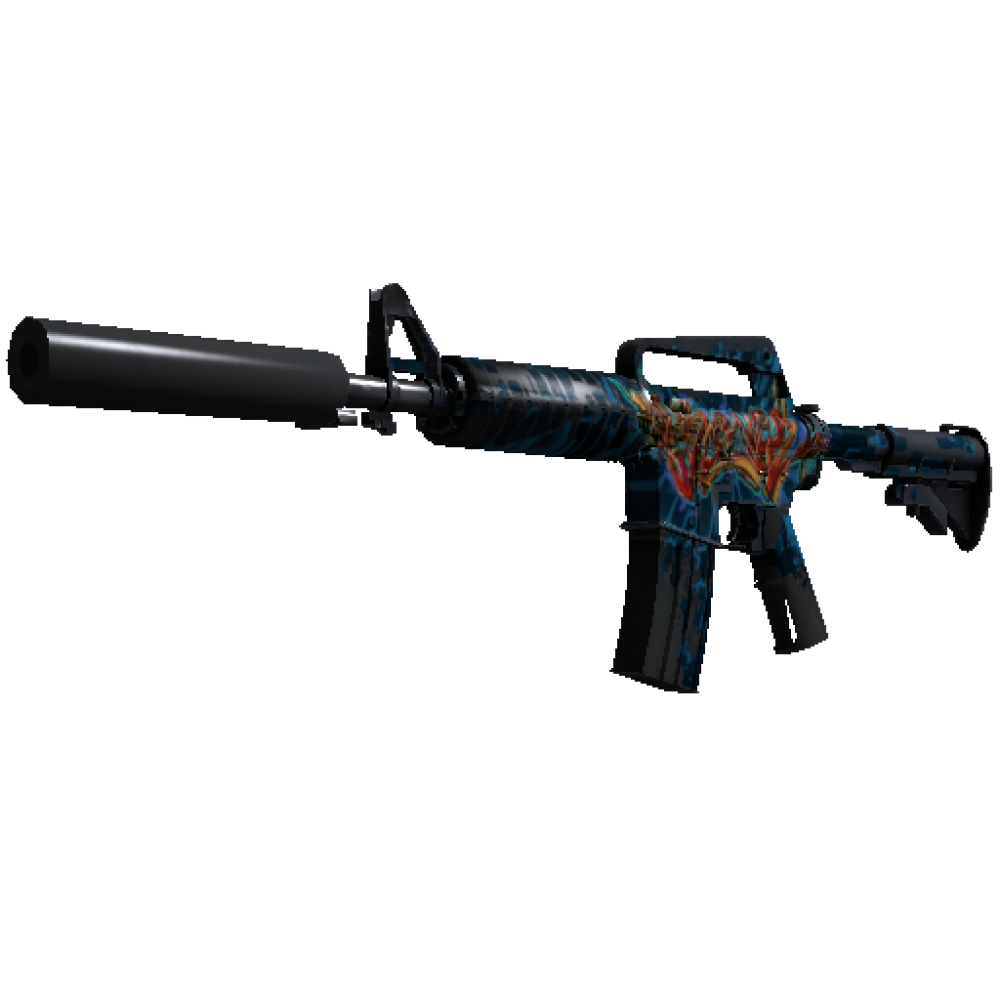 With a smaller magazine than its unmuffled counterpart, the silenced M4A1 provides quieter shots with less recoil and better accuracy. It has been custom painted with wildstyle graffiti.