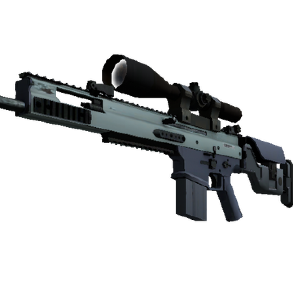 The SCAR-20 is a semi-automatic sniper rifle that trades a high rate of fire and powerful long-distance damage for sluggish movement speed and big price tag. It has individual parts spray-painted solid colors in a stormy color scheme. It will be waiting for you at the monorail